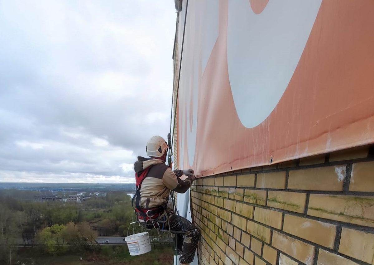 Монтаж рекламного баннера на фасад